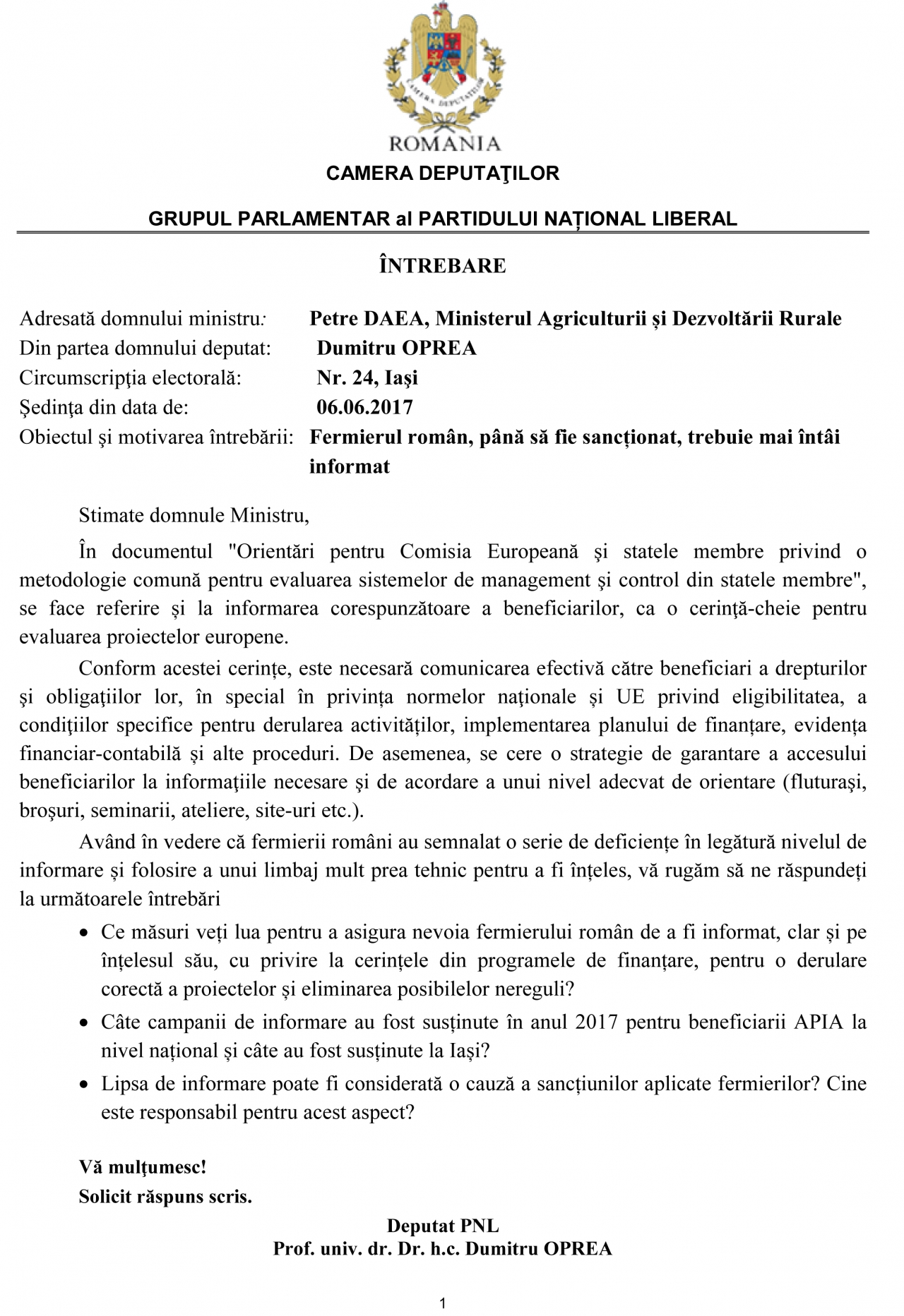 Într-o întrebare adresată Ministrului Agriculturii, marți, 6 iunie 2017, parlamentarul ieșean a arătat că se impune respectarea recomandărilor Comisiei Europene privind comunicarea cu beneficiarii fondurilor europene. Acest lucru este necesar atât în privința drepturilor şi obligaţiilor lor, cât și a normelor naţionale și ale Uniunii Europene privind eligibilitatea, condiţiile specifice de implementare a planului de finanțare, evidența financiar-contabilă și alte proceduri. În acest context, deputatul ieșean a solicitat Ministrului Petre Daea să prezinte măsurile pe care le va adopta pentru informarea fermierilor români privind cerințele și regulile proiectelor cu finanțare nerambursabilă, astfel încât derularea lor să fie corectă și să se elimine posibilele nereguli. De asemenea, trebuie clarificat cine își asumă responsabilitatea pentru sancțiunile aplicate fermierilor din lipsă de informații, motiv pentru care Dumitru Oprea a cerut numărul și valoarea campaniilor de informare, susținute în anul 2017, pentru beneficiarii APIA, atât la nivel național, cât și în Iași.