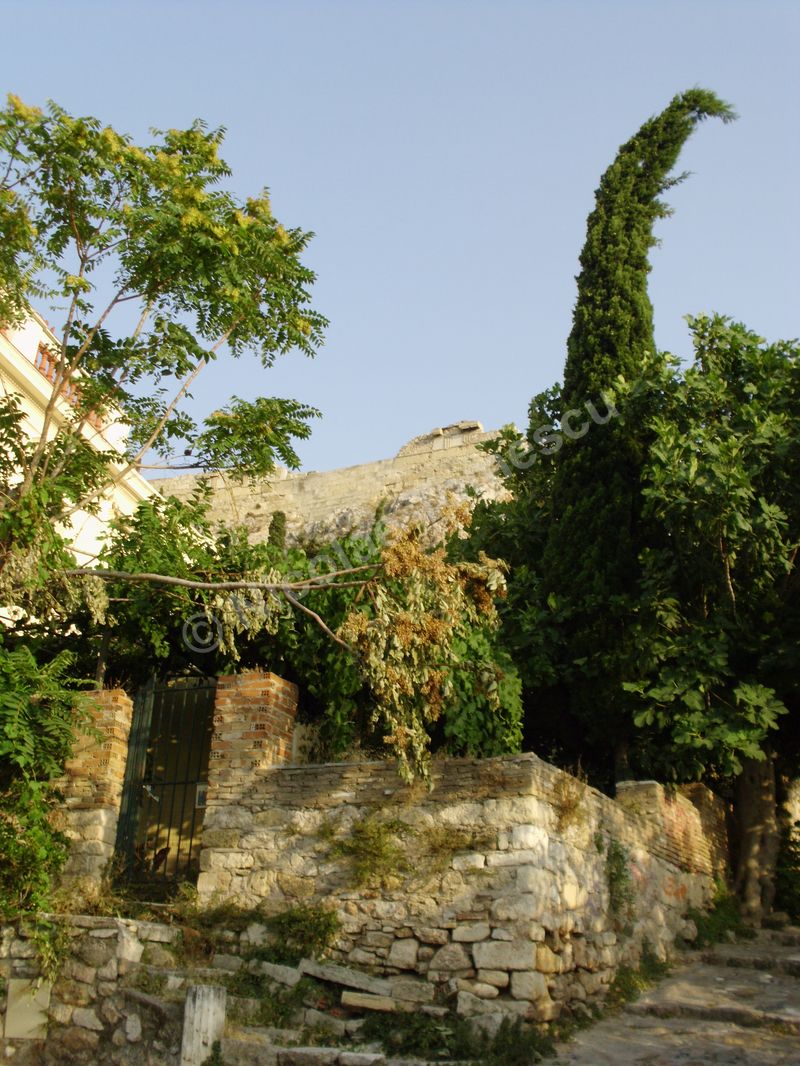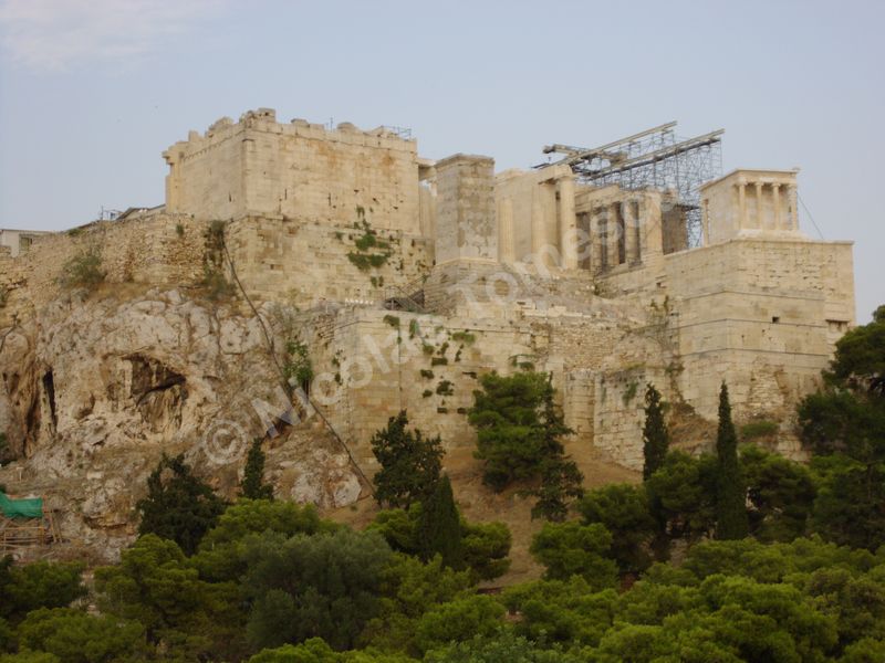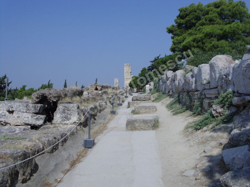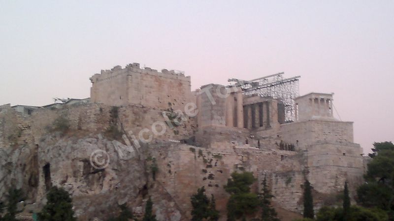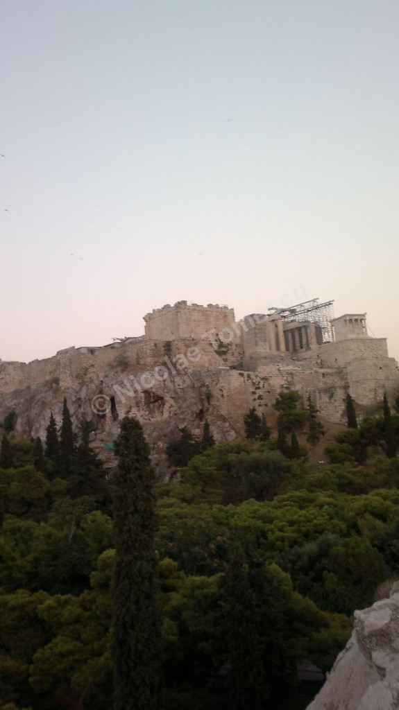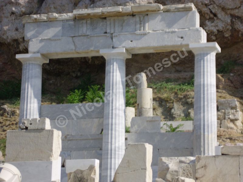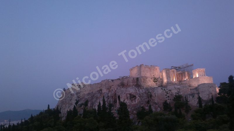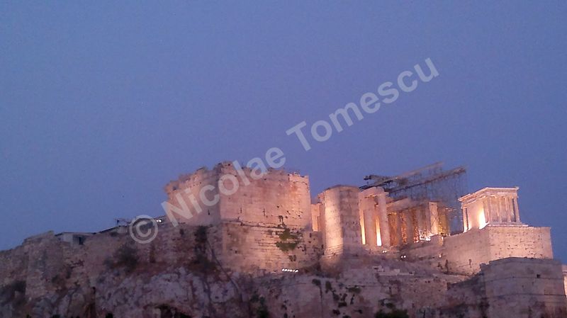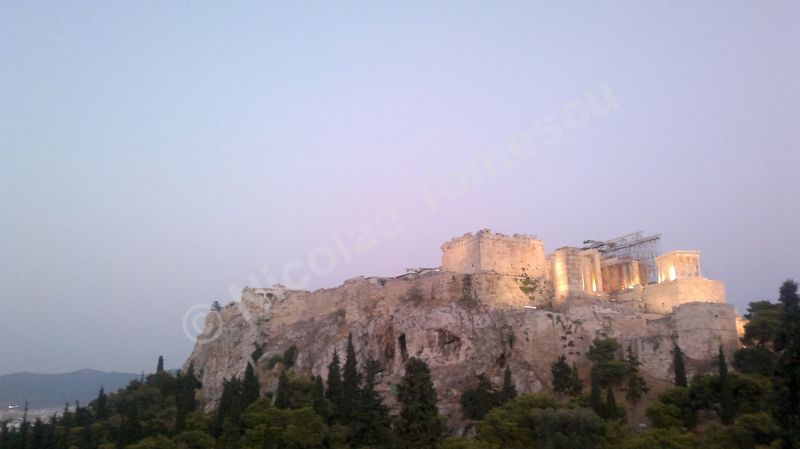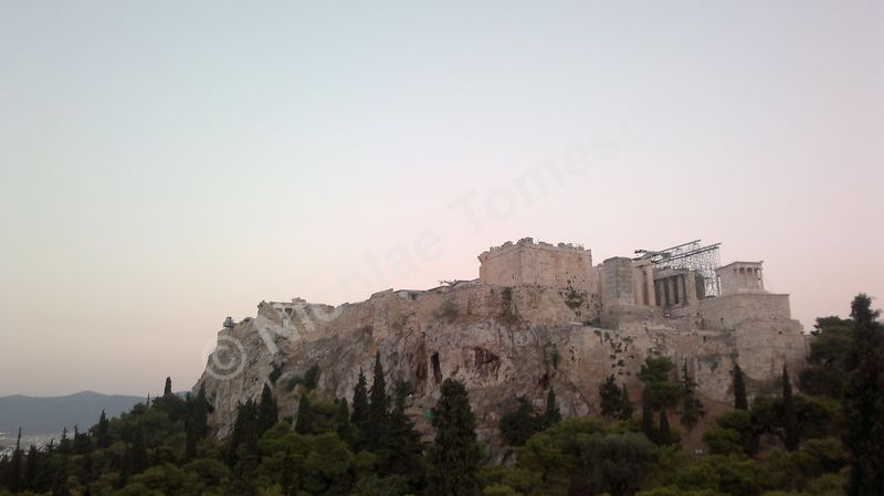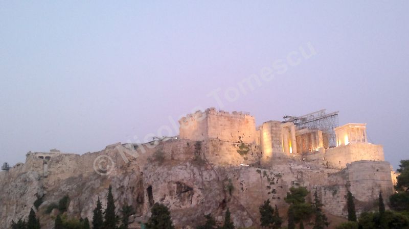 Mă aștepta cea mai renumită acropolă, citadela vechiului oraș, partea fortificată a Atenei, situată pe o colină, în centrul actualei metropole; edificată în perioada secolului de aur al lui Pericle (secolul al V-lea î. Hr.), la ridicarea ei au participat arhitecții Ictinios, Callicrates, Mnesicles, precum și sculptori îndrumați de Fidias. Ochiul, simbol al percepției intelectuale, dar și inima, centrul vital al ființei umane, mi-au recomandat străzile abrupte ale versantului nordic de la înălțimea cărora am văzut templul lui Hefaistos, am trecut pe lângă Biblioteca lui Hadrian, Muzeul Kanellopoulos, Muzeul de Istorie al Universității din Atena; priveliștea vastă, care poate fi contemplată din depărtare și de la înălțime, nu a exclus, calea de acces dinspre Dionysiou Areopagitou, adevărată arteră pietonală pentru turiști. Dinspre sud, cu Teatrul lui Dionysos în curs lent de restaurare, accesul pe Acropole se face urcând de-a lungul unei poteci care șerpuiește printre arbori și duce prin spatele celei mai impresionante clădiri de pe pantele sudice, Teatrul lui Herod Atticus.