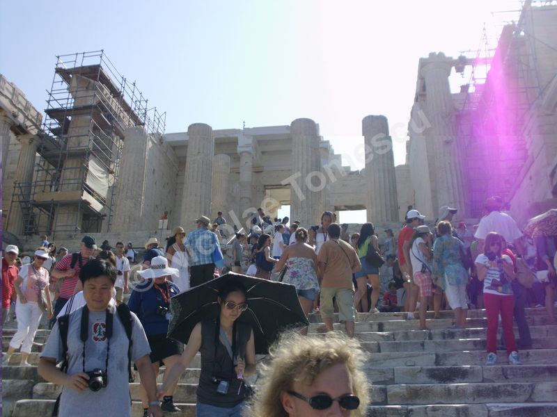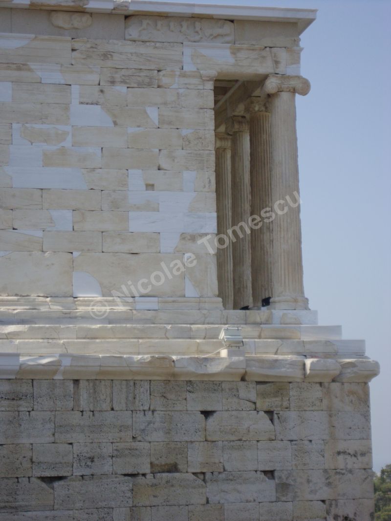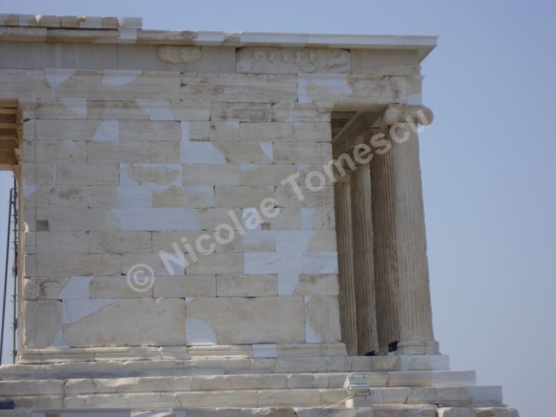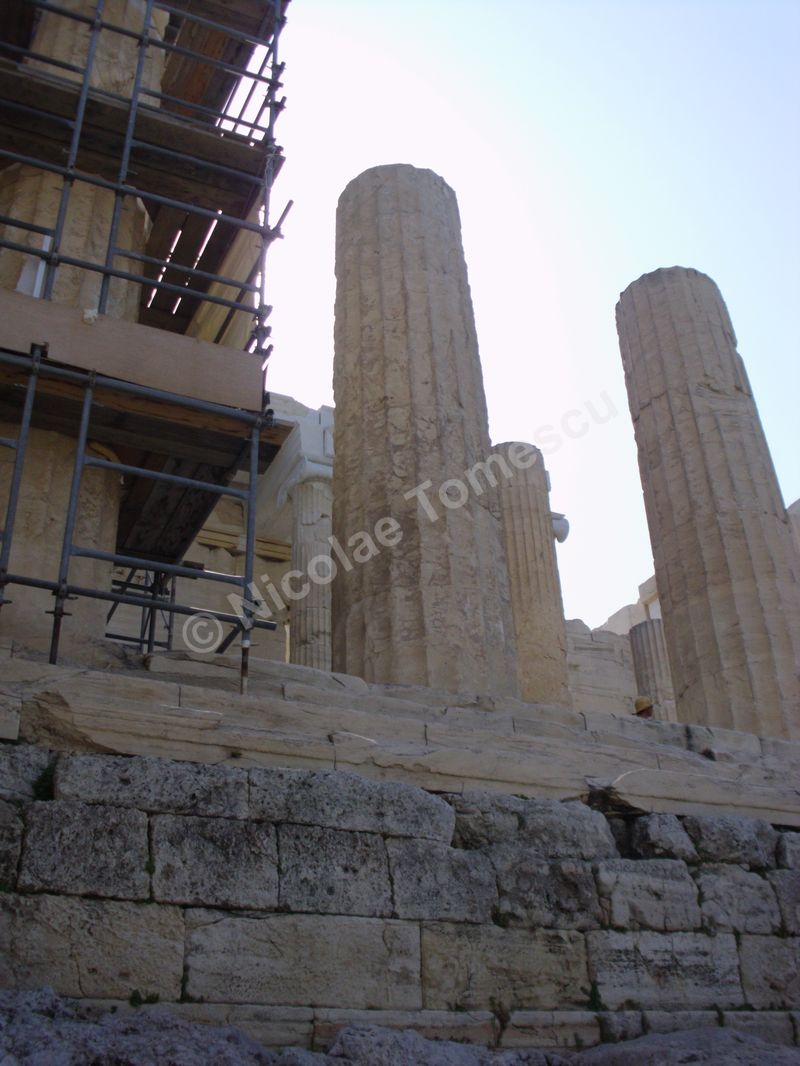 Îmi voi schimba opinia dacă revin pe Acropole? Unii au transformat macaraua uriașă în sistem de referință al imperfecțiunii; dar ea îndeplinește un rol vital în acțiunea de reconstrucție și păstrare a monumentului ale cărui blocuri de marmură s-au crăpat, din loc în loc, ceea ce presupune reîmbinarea. Propyleea, poarta tripartită de intrare, a servit drept reședință regilor și militarilor, dar și ca fortificație; pus la pământ în 1686, Templul Athenei Nike (Atena Victorioasă) a fost reconstruit ultima dată în 1935; Parthenonul, templu și… moschee, și-a pierdut acoperișul de marmură în explozia din 1687; Statuia Athenei Promachos (Atena Luptătoare) a fost sculptată de Fidias și ne-ar fi amintit de victoria împotriva perșilor; Locul vechiului Templu al Athenei ne-ar pregăti pentru Erechteion, templul ionic având faimoasele coloane cu cariatide…