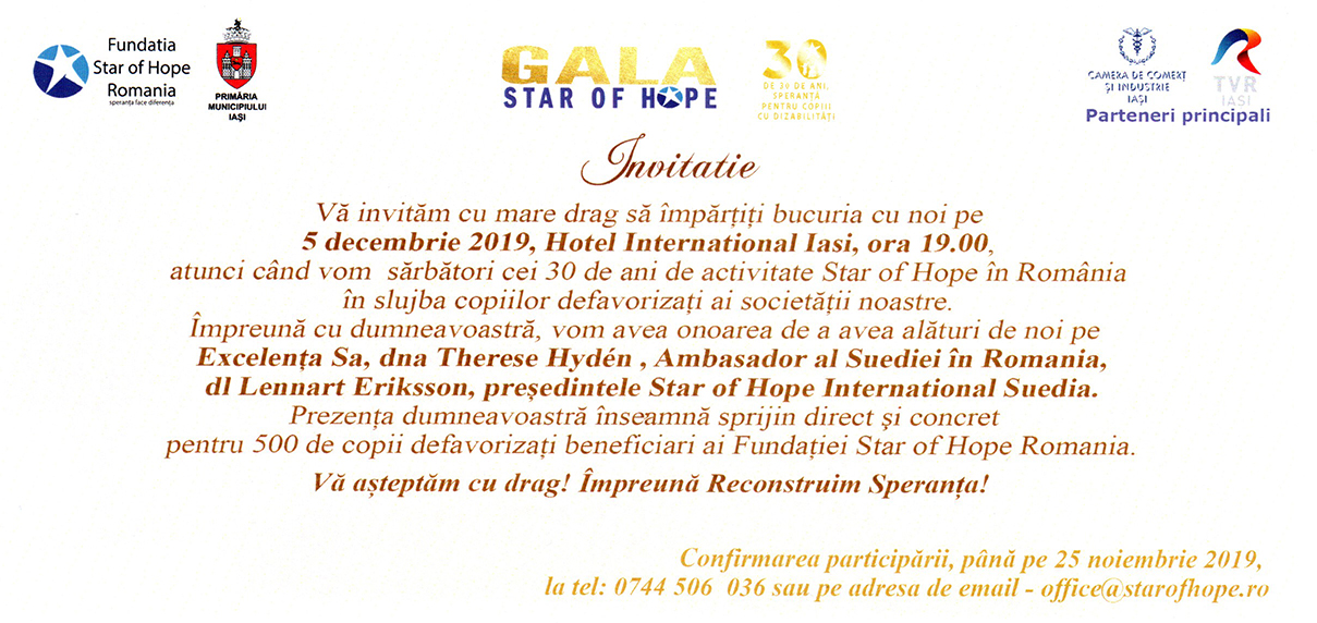 „De 30 de ani, echipa de specialiști Star of oh Hope România reconstruiește speranța pentru copiii defavorizați ai societății noastre. Nu singuri, ci împreună cu dumneavoastră, toți cei alături de care ajută (prin terapie, susținere materială, financiară și consiliere) copiii cărora alții nu le acordă nicio șansă. Și, se poate spune azi, după trei decenii, că, atunci când lucrezi cu un copil cu Sindrom Down, autism, tetrapareză spastică sau alte forme de dizabilitate, este nevoie de timp, de răbdare, de SPERANȚĂ. Da, de speranță, pentru că progresele copilului nu apar nici peste o zi, nici peste o săptămână, nici peste o lună. Apar după ani și ani de trudă zilnică în sala de terapie, prin efortul comun al specialistului terapeut, al copilului, al părintelui. De ce povestim toate acestea? Pentru că, în decembrie, echipa Star of Hope România sărbătorește 30 de ani de activitate in slujba copilului cu dizabilitate. De ce? Pentru că, azi, Andreea (tetrapareză spastică) este psiholog. Pentru că Răzvan este astăzi student la Facultatea de Automatizări și Calculatoare. Pentru că Bianca este astăzi studentă la Facultatea de Artă Sacră. Pentru că azi Andrei este un adult care duce o viață normală. Pentru că azi Alex este elev într-un liceu de masă și un pianist foarte talentat. Pentru ca, da, împreună și cu ajutorul dumneavoastră, Star of Hope România a reușit să schimbe în bine destine. Și pentru că, da, tot împreună cu dumneavoastră, vom reuși în continuare să reconstruim SPERANȚA pentru alți copii cu dizabilități cărora societatea în care trăim nu le oferă vreo șansă de recuperare (prejudecăți, inechitate legislativă, sărăcie, lipsa centrelor de recuperare din mediul rural, costul foarte mare al ședințelor de terapie la cabinetele de terapie private). Echipa Star of Hope România mulțumește partenerilor care au ales să facă parte din povestea Star of Hope România și anul acesta: FRAROM INTERNAȚIONAL EST, DIQIS, PROINVEST, MEDIAROM GRUP, MEDICOVER, FOCALITY, FARMACIA ARIS, STRAROM, QUATRZ MATRIX, MESOPOTAMIA, AGEOBIZ, DAL CONSULTING, BIOGENETIX, HOTEL INTERNATIONAL IASI, FONSS, VOCEA ONG..