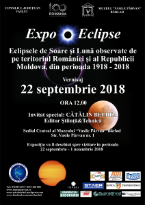 Cu prilejul Anului Centenar al Marii Uniri, Departamentul de Astronomie al Muzeului „Vasile Pârvan” din Bârlad organizează expoziţia temporară cu tema: Eclipsele de Soare şi Lună observate din România şi Republica Moldova în perioada 1918-2018.