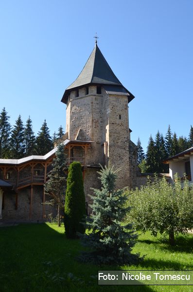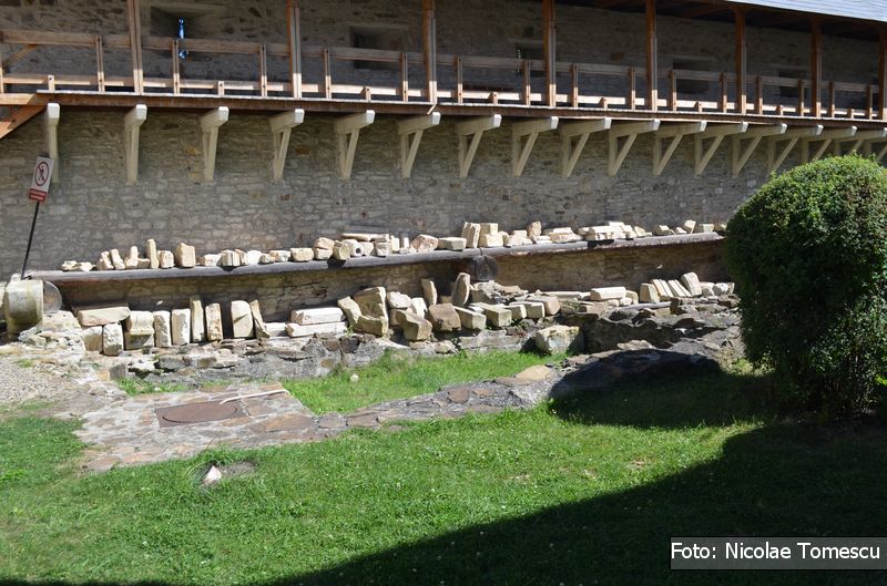 [27] În vecinătatea vestică a turnului actual de intrare, care datează din secolul al XVIII-lea, „s-a descoperit și a fost dezvelit în întregime un turn de formă pătrată, cu laturile de 5 metri și grosimea zidurilor de l metru, aparținând secolului al XV-lea”…