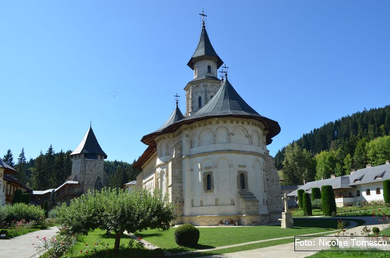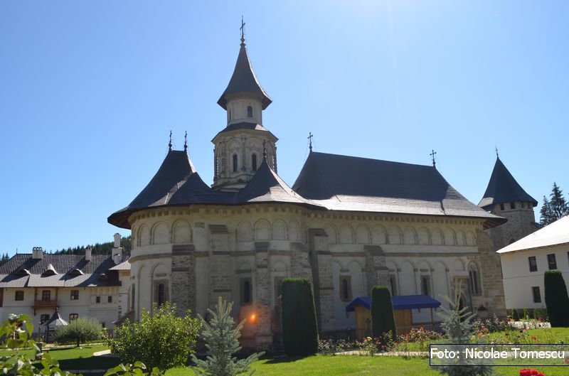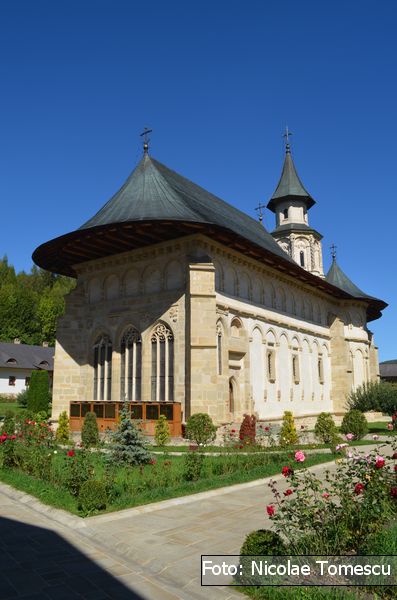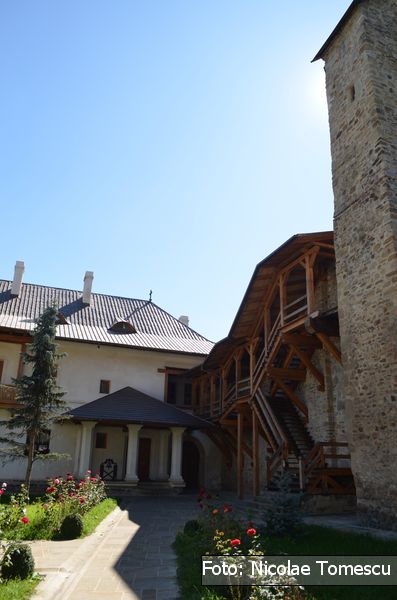 Intrarea în mănăstirea caracterizată de poet drept „Ierusalimul neamului românesc” s-a făcut pe unde se face și astăzi[27]; dacă un șanț de apărare[28] înconjura întreaga incintă, potrivit cunoscutului sistem defensiv, specific, în general, cetăților medievale, celelalte laturi ale zidului perimetral urmau traseele actuale[29]. Se păstrează intacte din secolul al XV-lea porțiunea de zid cuprinsă între actuala clopotniță și fundația vechiului zid de pe latura nordică a incintei, precum și faimosul turn al tezaurului[30].