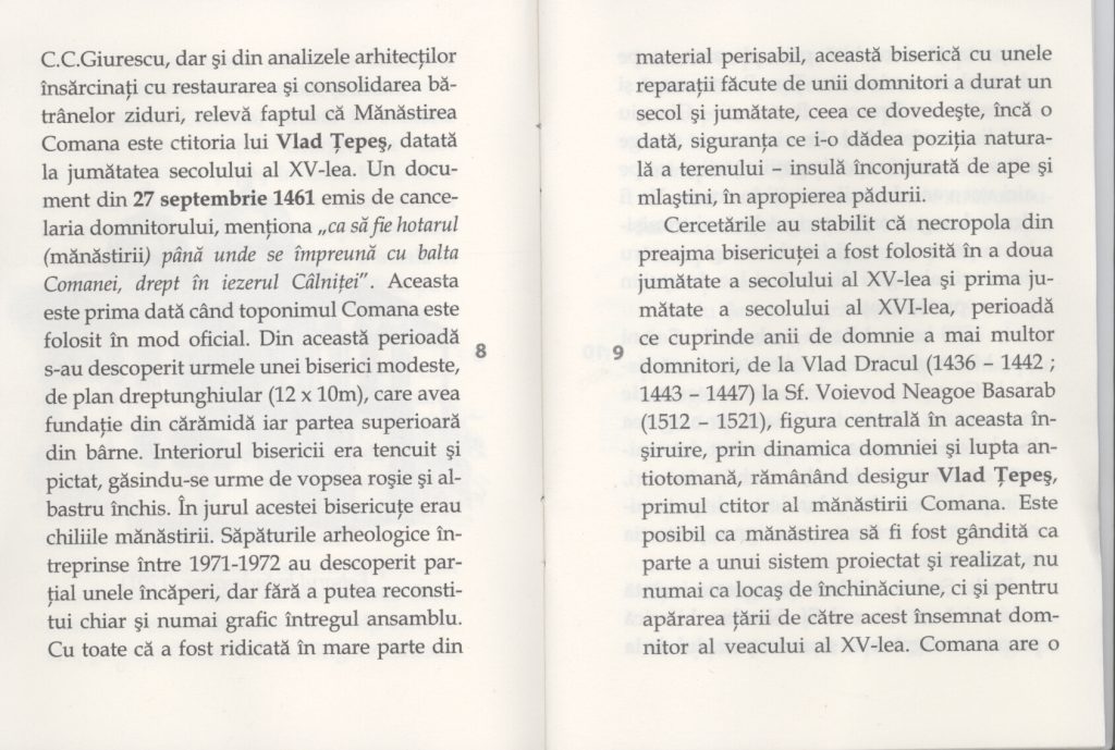 Mănăstirea Comana, situată în comuna Comana din județul Giurgiu, a fost ctitorită de Vlad Tepeș în anul 1461, ca o mănăstire-cetate, care însă s-a ruinat până la finele secolului al XVI-lea. Locul pe care a fost înălțată mănăstirea era, odinioară, o insulă în mijlocul mlaștinilor, iar accesul se făcea pe o poartă aflată în nordul incintei, după ce se traversa un pod de lemn, ușor de incendiat la vreme de primejdie. Râul Calniștea, care curge în partea de răsărit a satului Comana, întâlnește în cale balta Comanei pe care o străbate și din care se desprinde în fața mănăstirii; în dreptul satului Comana, apa desface un braț care ocolea ostrovul și se reîntoarcea apoi la vechea matcă…