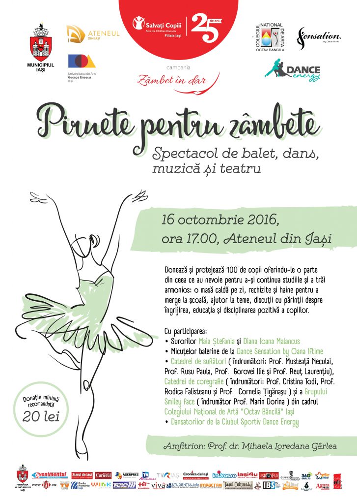 Duminică, 16 noiembrie 2016, începând cu ora 17.00, ieșenii sunt așteptați la spectacolul de  balet, dans, muzică și teatru “Piruete pentru zâmbete” al cărui amfitrion este Prof. dr. Mihaela Loredana Gârlea. Găzduit de Ateneul din Iași, spectacolul va fi susținut cu măiestrie de: surorile Maia Ștefania și Diana Ioana Malancus, micuțele balerine de la Dance Sensation by Oana Iftime, Catedra de suflători, Catedra de coregrafie și grupul “Smiley Face” din cadrul Colegiului Național de Artă „Octav Băncilă” și dansatorii de la Clubul Sportiv Dance Energy. Donația minim recomandată în cadrul acestui eveniment este de 20 de ron.