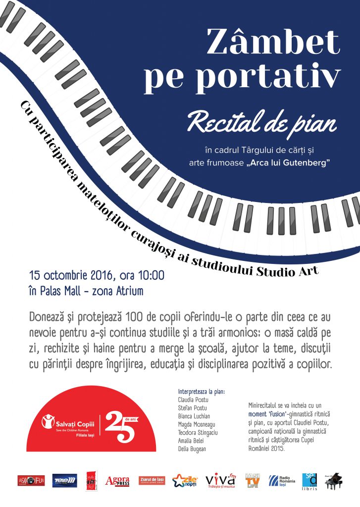 În weekendul 15-16 octombrie 2016, ieșenii sunt invitați la două evenimente artistice de excepție susținute de tinerele talente ale Iașului: “Zâmbete pe portativ – Recital de pian”, eveniment organizat în Atrium Palas în cadrul Târgului de cărți și arte frumoase “Arca lui Gutenberg” și spectacolul de balet, dans, muzică și teatru “Piruete pentru zâmbete”, care va avea loc la Ateneul din Iași. Evenimentele fac parte din campania “Zâmbet în Dar” desfășurată de organizația Salvați Copiii Iași.
